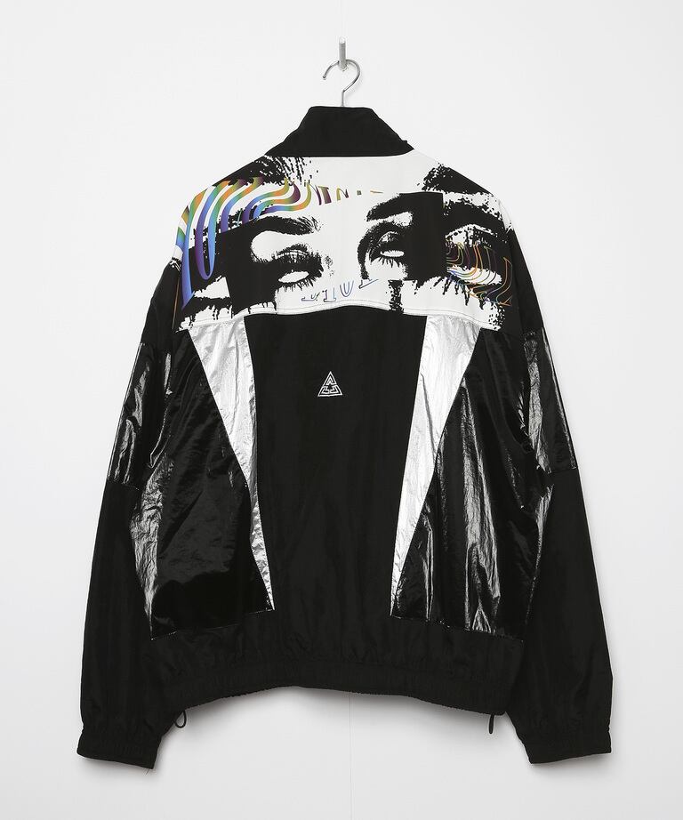 今回、ナイロン素材で防風性を持たせつつ光沢のある別の生地で切り替えつつも落ち着いたブルーとブラックのベース生地で全体的にまとまりを持たせつつバックヨークには定番とも言えるグラフィックをプリントし、さらに中央にはアイコンを刺繍で表現。 裏地も取り付けたり袖元や裾はゴム入りのリブを取り付けることで中に風を通しにくくしつつ裾はドローコード入でシルエットに変化を付けることも可能。さらに落としたショルダーで動作が取りやすいのもポイント。スポーティーさとファッション性が詰まったまさにミックススタイルにぴったりの一着です。