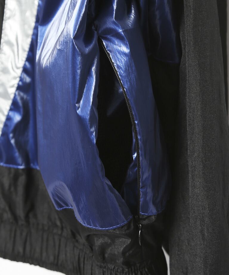 今回、ナイロン素材で防風性を持たせつつ光沢のある別の生地で切り替えつつも落ち着いたブルーとブラックのベース生地で全体的にまとまりを持たせつつバックヨークには定番とも言えるグラフィックをプリントし、さらに中央にはアイコンを刺繍で表現。 裏地も取り付けたり袖元や裾はゴム入りのリブを取り付けることで中に風を通しにくくしつつ裾はドローコード入でシルエットに変化を付けることも可能。さらに落としたショルダーで動作が取りやすいのもポイント。スポーティーさとファッション性が詰まったまさにミックススタイルにぴったりの一着です。